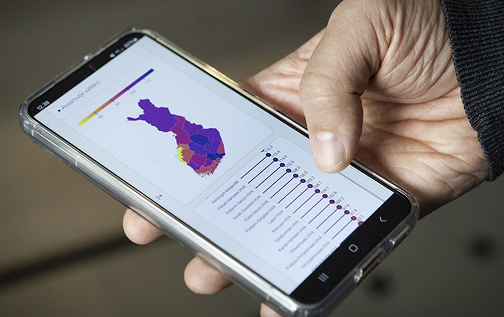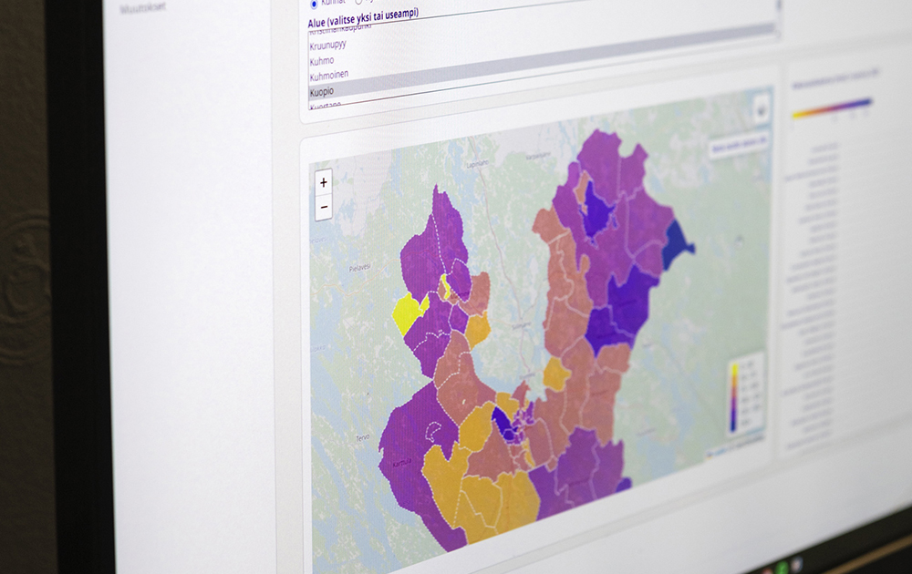 ”Jos tarkastelemme karttapalvelun avulla esimerkiksi Pohjanmaata, huomaamme, että ihmiset tuntuvat olevan siellä onnellisia kaikilla mittareilla. Ovatko syinä sitten ravitsemus, yhteisöllisyys ja pitkä historia eli ’kala ja kuorolaulu’, vai onko taustalla muitakin tekijöitä, kuten monenlaista yrittäjyyttä sekä monipuolinen elinkeinorakenne ja sitä kautta syntyviä työmahdollisuuksia”, pohtii psykiatrinen sairaanhoitaja ja terveystieteen tohtori Varpu Wiens näyttäessään, kuinka Diakonia-ammattikorkeakoulussa eli Diakissa kehitettyä karttapalvelua käytetään.