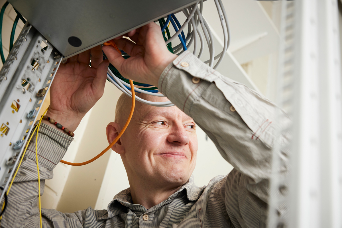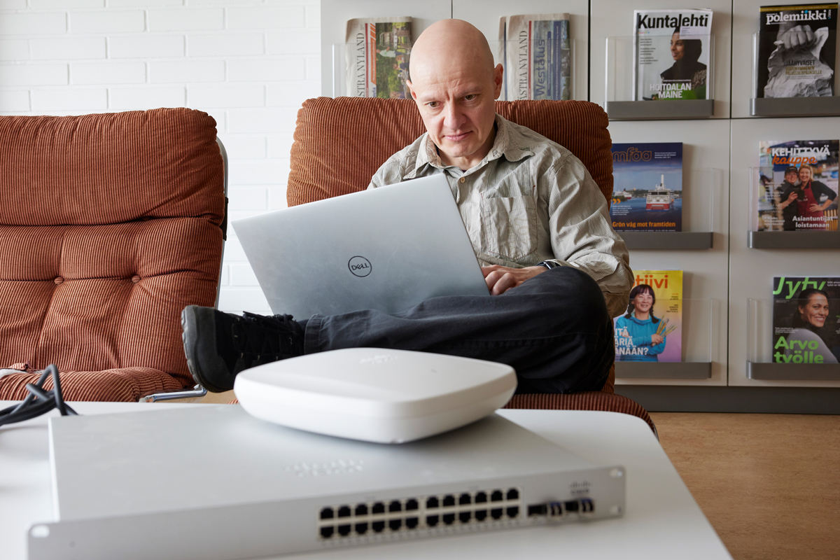 Luotettava tietoliikenneverkko on nykyään kaiken IT-toiminnan perusta. Tomi Ruha on tyytyväinen modernisointiprojektin lopputulokseen: uusi toimintavarma, tehokas ja turvallinen verkko palvelee Kauniaisten yli 600 työntekijää pitkälle tulevaisuuteen.