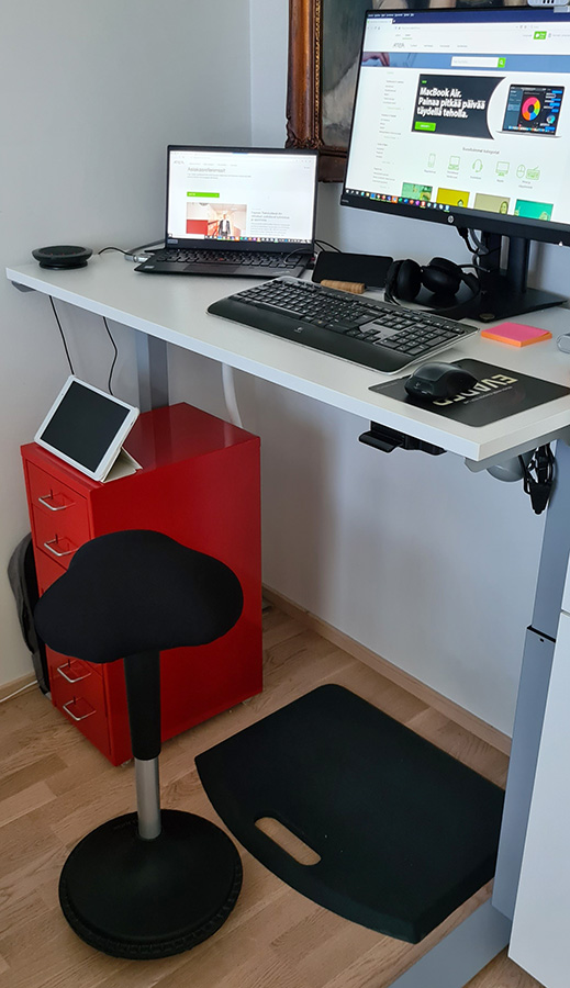 Tuotteet toimitettiin ripeästi ja pöydän kokoamisessa meni muutama tunti. Sen jälkeen minulla oli uusi etätyöpisteeni kaikilla herkuilla käytössä. Aloittaessani etätyöpäivät uudelleen varustellulla työpisteellä,  huomasin heti, että selkä ja muut vaivat olivat helpottuneet. Nyt olen maaliskuun puolen välin jälkeen käynyt toimistolla vain kaksi kertaa ja työpiste on maksanut itsensä takaisin monin verroin.