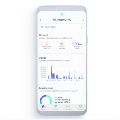 Meraki Go:n -pilvipohjaisella ratkaisulla, pystyt hallinnoimaan langatonta verkkoa Meraki Go-mobiilisovelluksella milloin tahansa ja mistä tahansa. Voit tarkastella Internetin kulutusta, säädä käyttöä, luo turvallisia vieraskirjautumisia, estä verkkosivustoja tai etäyhteys verkkoihin - se on kaikki yhtä helppoa kuin minkä tahansa muun älypuhelinsovelluksen käyttö.
