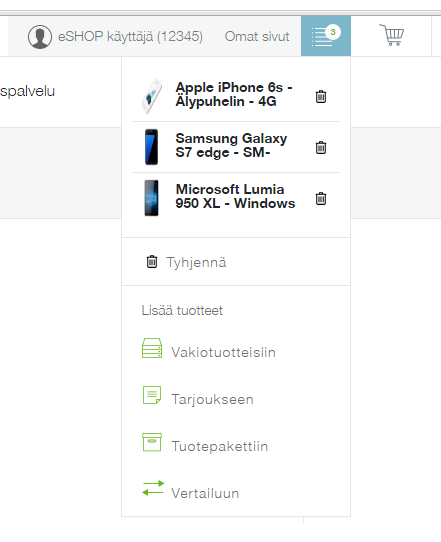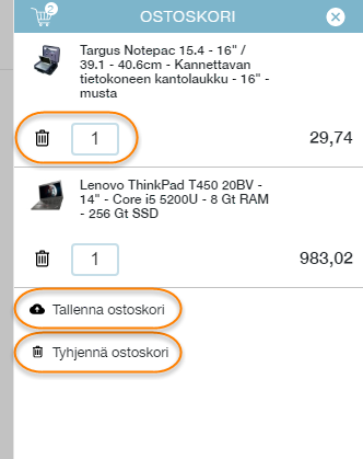 eSHOPin oikeasta ylänurkasta avautuvassa ostoskorissa voit helposti muokata tuotteiden määriä, poistaa tuotteita ostoskorista, tallentaa ostoskorin myöhempää käyttöä varten tai tyhjentää koko ostoskorin.