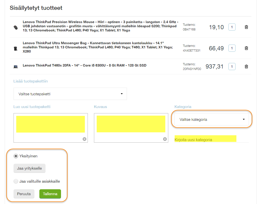 Tuotepaketille annetaan nimi, kuvaus (vapaaehtoinen) ja valitaan sille kategoria tai luodaan uusi. Lisäksi valitaan, näkyykö tuotepaketti vain itselle vai valituille yrityksen asiakasnumeroille. Tuotepakettiin voi myöhemmin lisätä tuotteita valitsemalla ”Lisää tuotepakettiin” ja valitsemalla olemassa oleva tuotepaketti listalta.