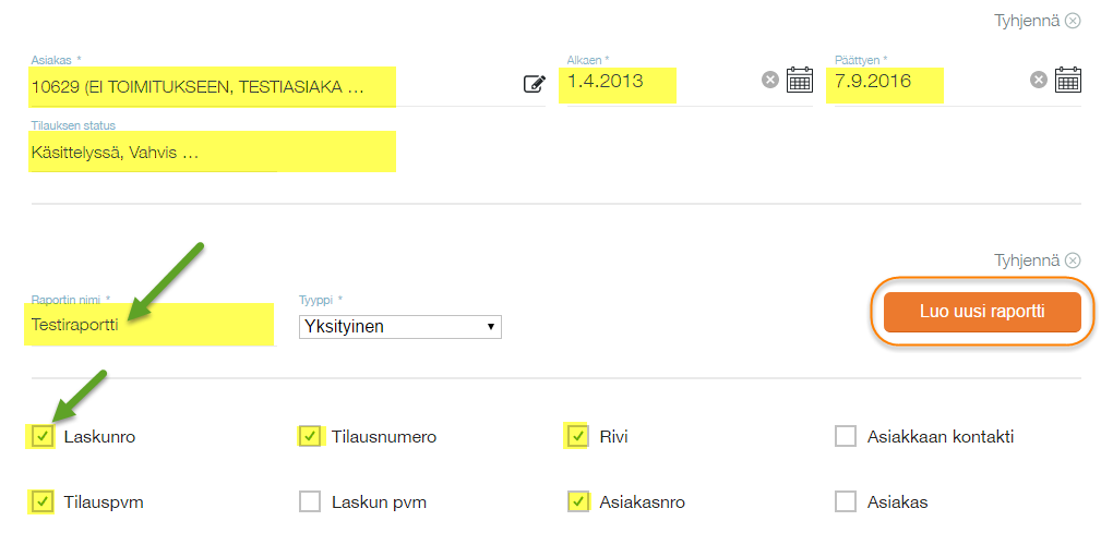 Täytä hakukriteerit raporttia varten. Huomioithan että Raportin nimi ja halutut kentät tulee täyttää ennen raportin luomista. Painike muuttuu oranssiksi vasta kun pakolliset tiedot on syötetty.