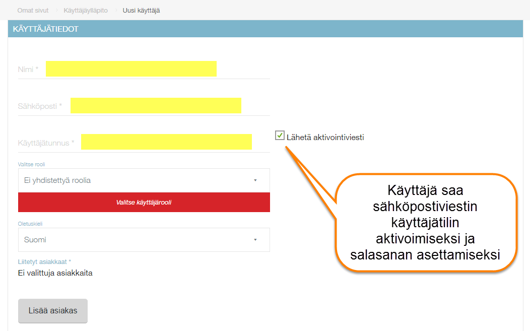 Valitse rooli Valitse käyttäjärooli jonka mukaan uuden käyttäjän oikeudet määräytyvät
