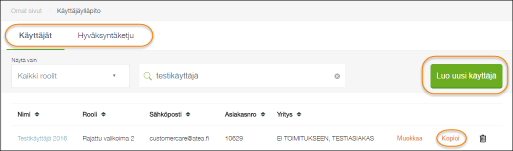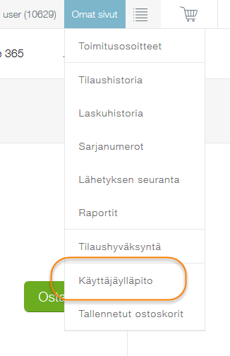 Mikäli sinulla on ylläpito-oikeudet eSHOPiin, voit luoda uusia käyttäjiä valitsemalla ylävalikosta Omat sivut-> Käyttäjäylläpito. Voit myös tarkastella yrityksesi hyväksyntäketjua käyttäjäylläpidon kautta.