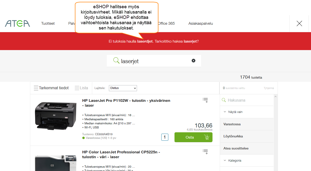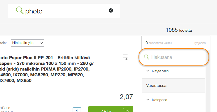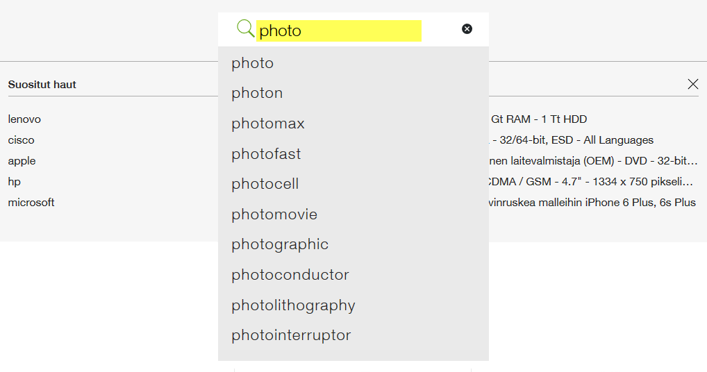 Kun kirjoitat sanan hakukenttään, eSHOP tekee ehdotuksia hakusanoista. eSHOP ehdottaa vain sanoja ja tuotteita jotka ovat osa valikoimaamme.