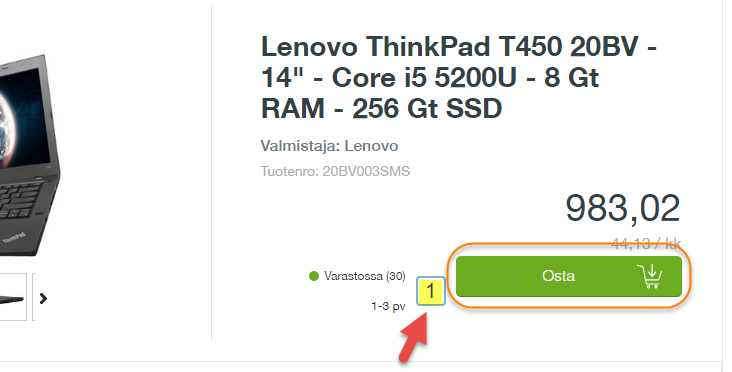 Tuote siirtyy ostoskoriin sivun oikeaan yläreunaan.
