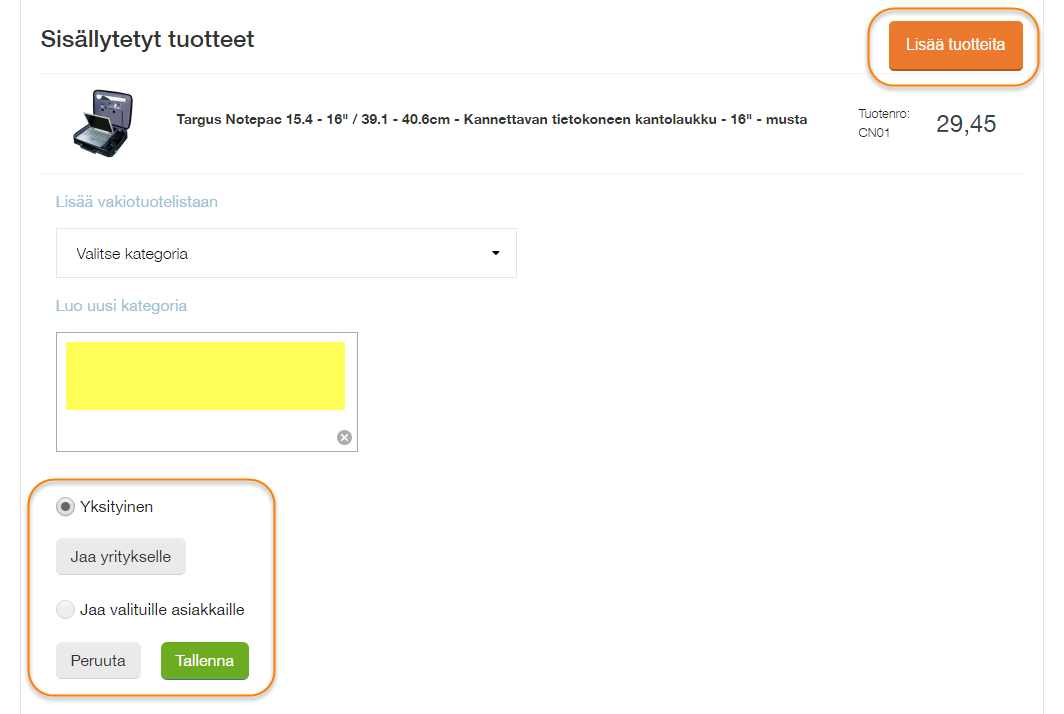 Vakiotuotteita tallentaessa valitaan, lisätäänkö ne johonkin olemassa olevaan vakiotuotekategoriaan vai luodaanko uusi. Mikäli luodaan uusi vakiotuotekategoria, valitaan lisäksi, tallennetaanko se vain itselle vai jaetaanko se valituille yrityksen asiakasnumeroille.
