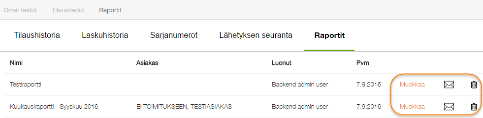 Voit myös lähettää raportin haluamiisi sähköpostiosoitteisiin valitsemalla kirjekuoren kuvan. Mikäli raportti on liian suuri lähetettäväksi sähköpostiin, saat ilmoituksen ennen lähetystä. Raportti tulee sähköpostiin Excel -muodossa.
