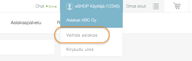 Mikäli käyttäjätunnukseen on liitetty useita asiakasnumeroita, voi asiakasta vaihtaa valitsemalla eSHOPin ylävalikosta ”Vaihda asiakas”.