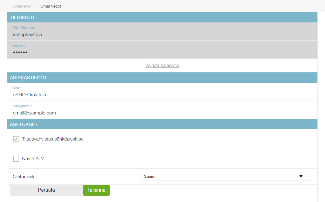 Omat tiedot -sivulla voit esimerkiksi vaihtaa salasanasi, muokata omia tietojasi ja asetuksiasi ja vaihtaa kaupan kieltä.