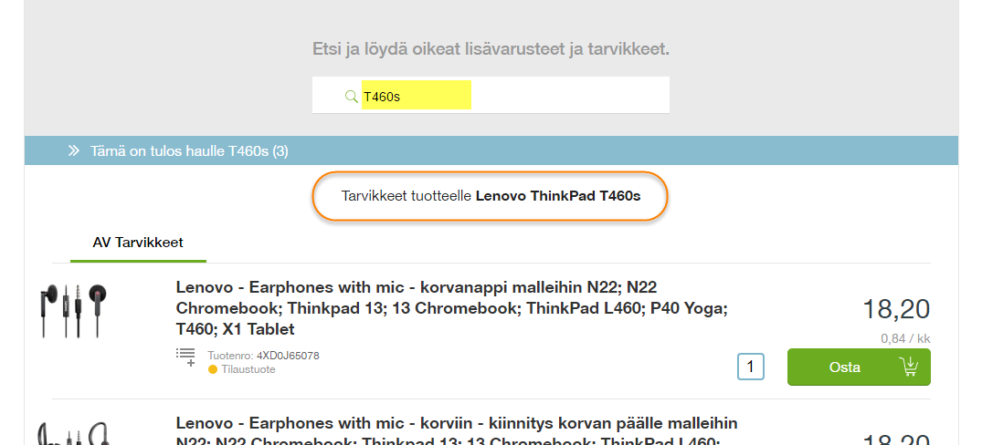 Hae haluamasi tuote (kts. kohta "Tuotteiden hakeminen") ja valitse ’Osta’ -painike siirtääksesi tuote ostoskoriin. Voit siirtää ostoskoriin kerralla useita tuotteita kirjoittamalla haluamasi määrä ’Osta’ painikkeen vieressä olevaan numerokenttään.