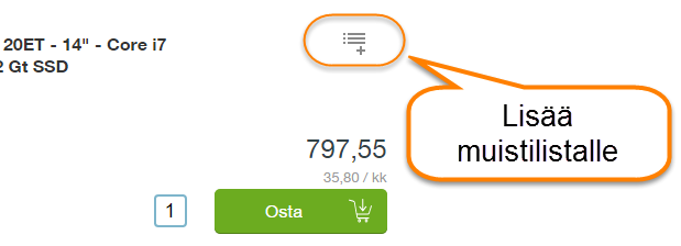 Voit lisätä tuotteita muistilistalle tuotelistauksista ja tuotekorteilta löytyvällä painikkeella.