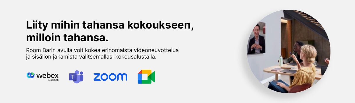 Room Bar on monipuolinen videoneuvotteluväline, joka tarjoaa kaiken – natiivista, kannettavattomasta videoyhteistyöstä saumattomiin BYOD-kokemuksiin USB-läpimenon kautta. Muuta kokouksesi huonelaitteella, joka yhdistää 4K-kameran, tehokkaan koodekin, sisäänrakennetut mikrofonit, stereokaiuttimet ja joukon liitäntävaihtoehtoja — tukemalla valitsemiasi näyttöjä.