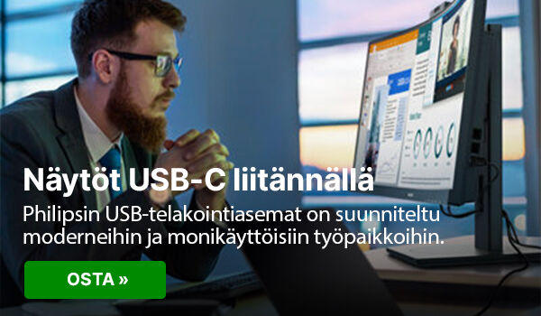 Philipsin USB-C-liitännöillä varustetuissa näytöissä on sisäänrakennettu telakointiasema, johon voit liittää hiiret, näppäimistöt, verkkokaapelit ym. ihan vain helpottamaan työtäsi. Yhdellä kaapelilla hoituvat niin verkkoyhteys, kuva, ääni kuin latauskin, joten saat yhdessä paketissa kaikki monitoimityöaseman edut, joilla optimoit ja lisäät työtehoasi.