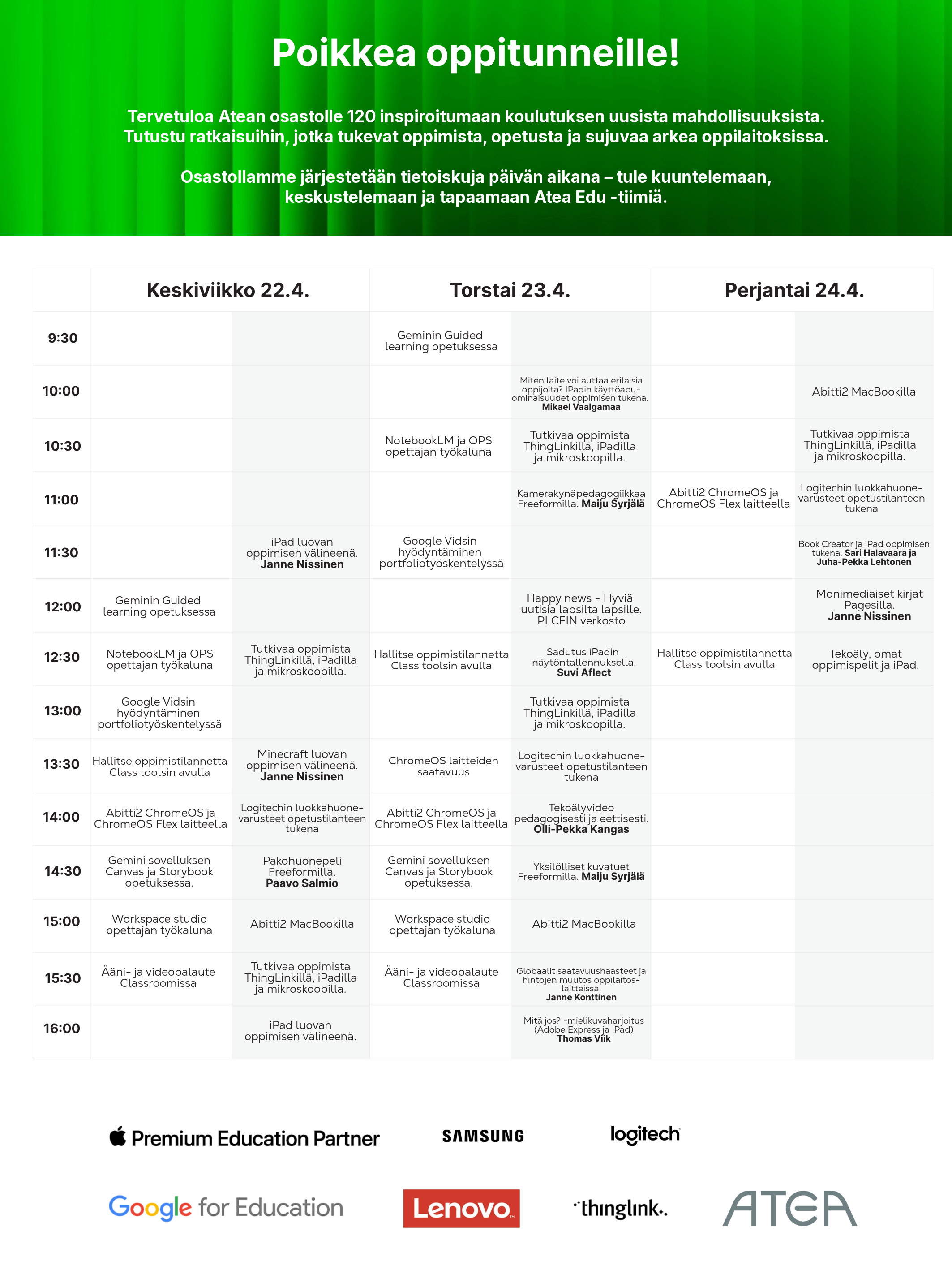 Tervetuloa Atean osastolle 120 inspiroitumaan koulutuksen uusista mahdollisuuksista. Osastollamme järjestetään pedagogisia työpajoja koko tapahtuman ajan - tule kuuntelemaan, keskustelemaan ja tapaamaan Atean Edu-tiimiä.