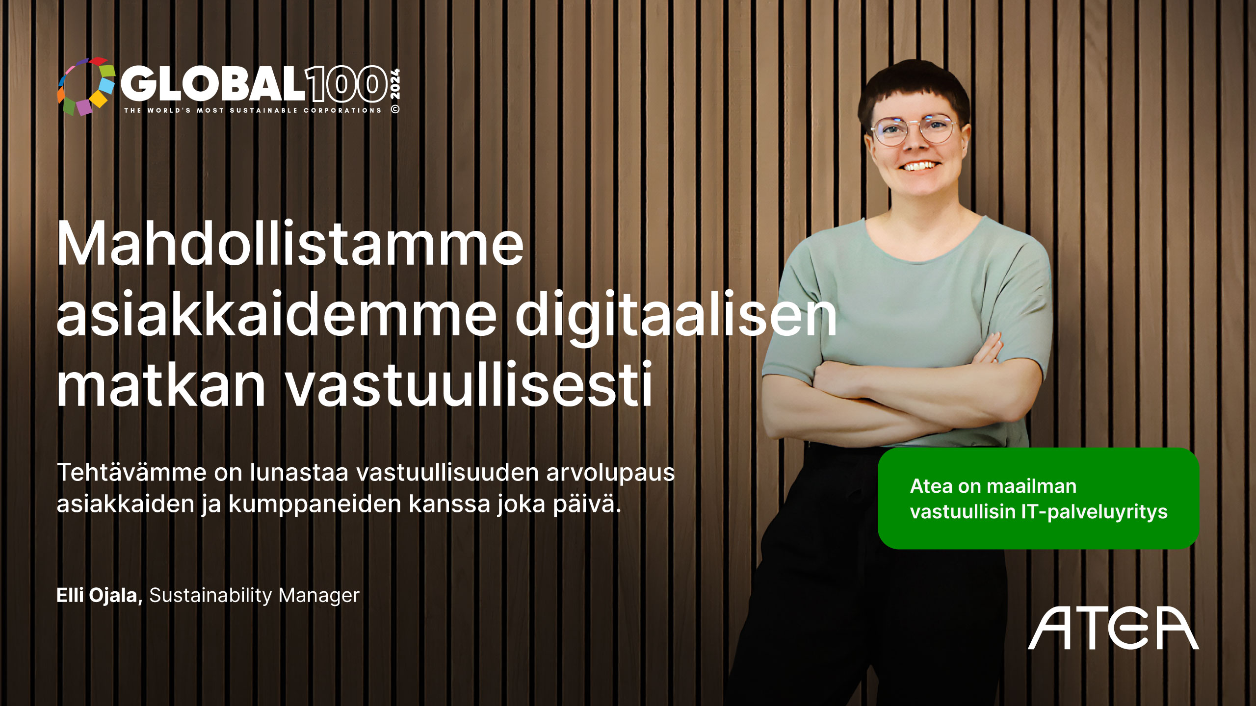 ”Vastuullisuustyömme ytimessä on jatkuva parantaminen. Olemme sitoutuneet vastuullisuuden kehittämiseen koko arvoketjussamme, ja meidän pitää lunastaa arvolupauksemme asiakkaidemme ja kumppaneidemme kanssa joka päivä. Vuosi vuodelta parantuva sijoituksemme Global 100 -indeksissä osoittaa, että teemme oikeita asioita”, Atea Finlandin vastuullisuuspäällikkö Elli Ojala sanoo.